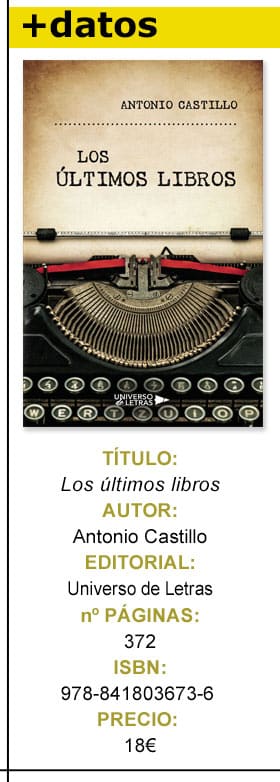 Los últimos libros es la opera prima de Antonio Castillo, un periodista enamorado de la literatura, un ávido lector que en este libro nos invita a un original paseo por más de 80 títulos dorados de la literatura más escondida entre los recovecos de las librerías de viejo.