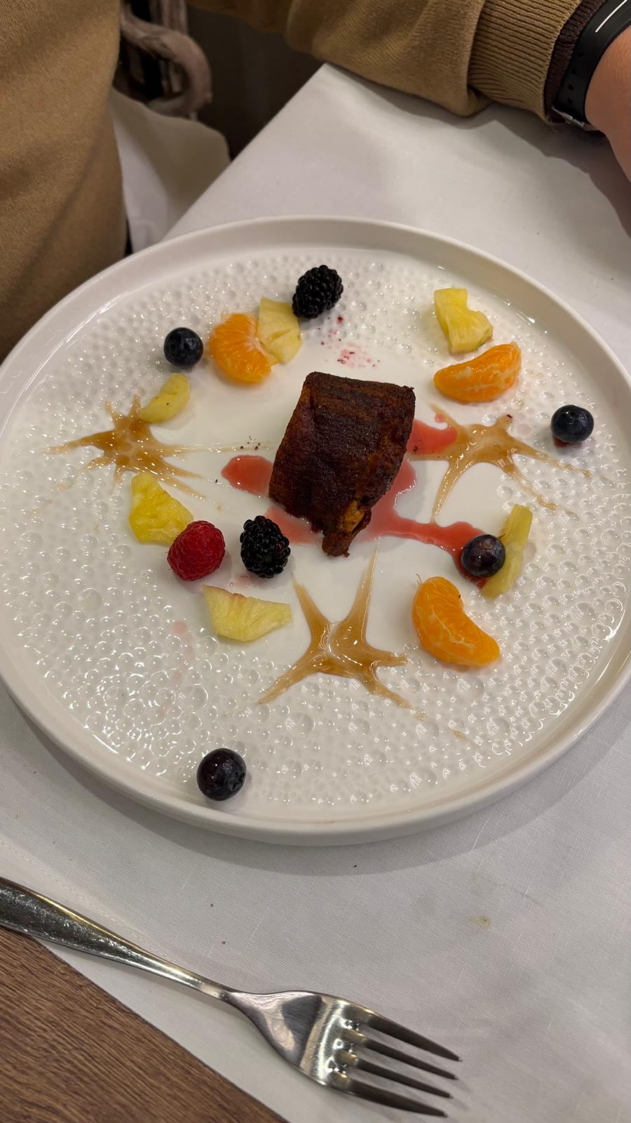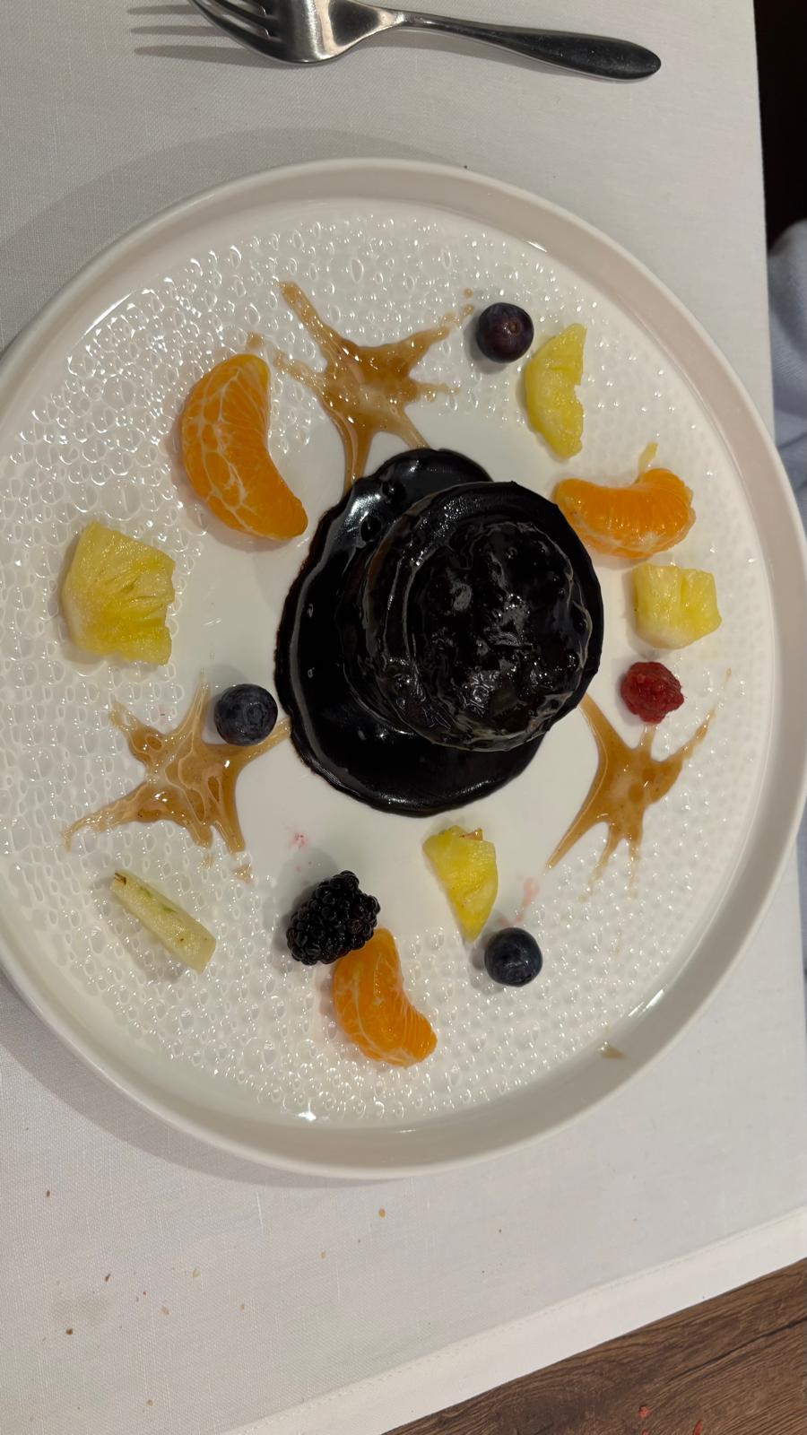 También destaca la delicia de manzana y yogur, fresca y equilibrada, aunque el verdadero protagonista fue el “Perfume de Amarone”, un postre de la casa elaborado con chocolate negro y vino tinto de Valpolicella. Sencillamente exquisito.