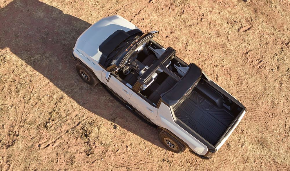 El nuevo Hummer dispone de carrocería pick-up con una parte posterior con gran capacidad de carga. Su techo cuenta con una impresionante superficie acristalada y se puede desmontar por partes o totalmente. A bordo hay espacio para cinco personas y cuando se ha retirado todo el techo estas están protegidas por una estructura central.
