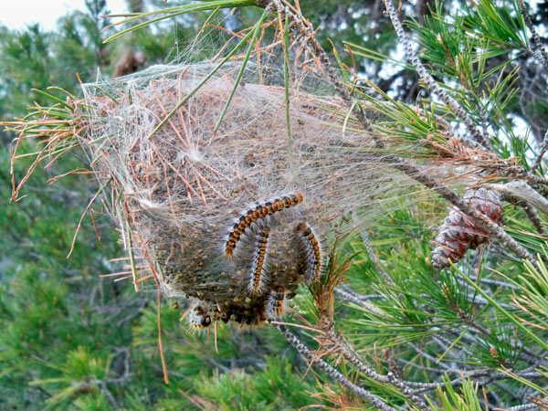 El ciclo de esta procesionaria “Thaumetopoea Pityocampa” es bastante curioso: las orugas tienen un comportamiento social, pasarán el resto de su vida con sus hermanas de puesta. Estas desarrollarán toda su vida larvaria sobre el mismo árbol, y solo lo abandonarán para hacer la procesión o bien para buscar un pino contiguo si han agotado la totalidad de las acículas del pino donde nacieron. Esto debe ser lo que está pasando en el cerro por que como se puede ver en las fotos, no quedan acículas ninguna.