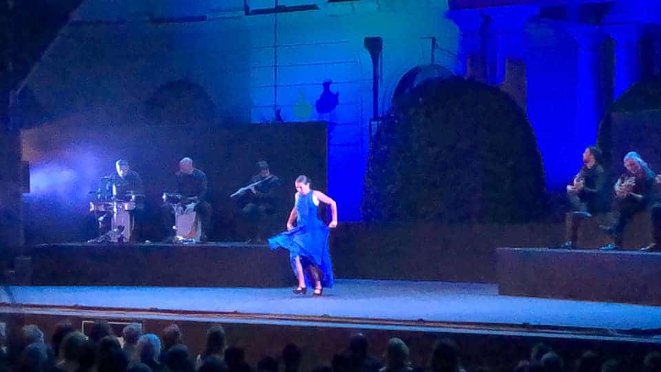 El contraste era un escenario minimalista, sin decorados, sin parafernalias, una estructura de dos niveles sencilla, primer nivel para los bailaores y segundo para la banda, en la que todo funcionaba a las mil maravillas gracias a sus amplios espacios con un pasillo central por el que iban apareciendo los artistas.