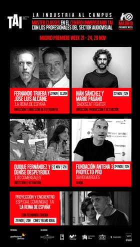 Se trata de citas imprescindibles para cinéfilos, profesionales, aficionados, estudiantes y público en general que, además del estreno de las producciones, tendrán la posibilidad, un año más, de disfrutar con las master classes matinales que durante la semana del festival organizará el Centro Universitario de Artes TAI en su sede, sita en la calle Recoletos, 22. El programa previsto de encuentros y master classes (del 21 al 24, a las 12 horas), que incluye una jornada especial con la Fundación Atresmedia, es el siguiente: