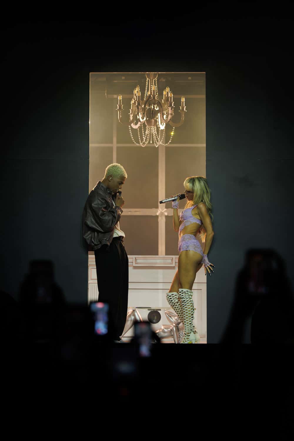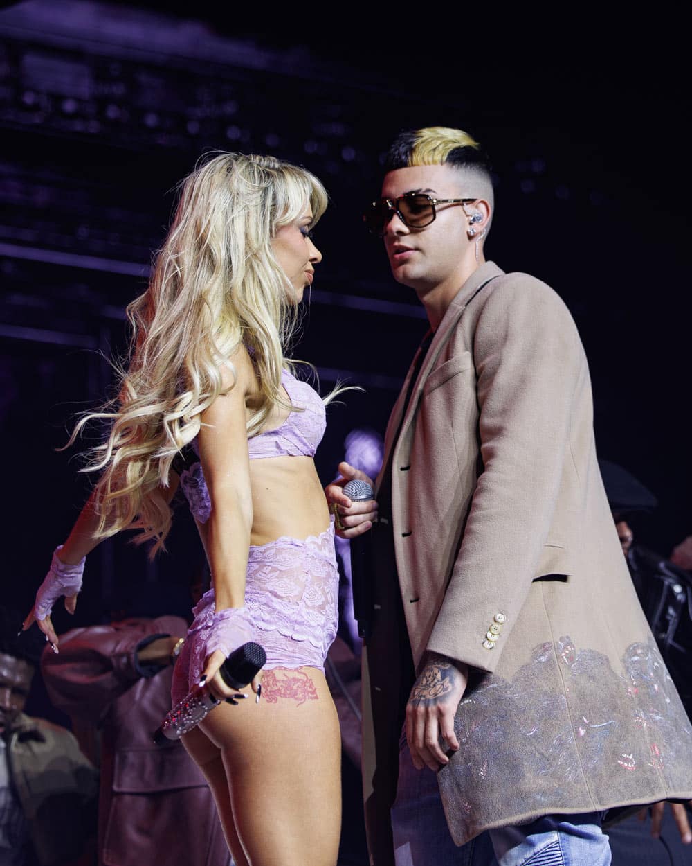Vuelven a bajar los cubos para montar la nueva configuración escénica y la espera se hace algo larga, matando un poco el mood todo hay que decirlo. Un vídeo muy ilustrativo sobre las costumbres gastronómicas caras que gasta la mayor de las Farelo, comiendo ostras y caviar forrada de joyas y en posición de diva extrema imposible, la catalana y sus bailarines vuelven a escena para iniciar el segundo bloque con Fashion Girl pt. 2, en la que nuestra diva no dudó en hacerse un zumo de naranja y beberlo en directo. La fiesta continúa con una selección de hits colaborativos en los que Alba tiene sus mayores y mejores momentos junto a los bailarines exponiendo sus sobresalientes capacidades coreográficas y entre las que, además del tema con Jadiel, también sonaron Perro (performance con cuchillo incluido) junto a Víctor Mendivil, Choque con Chencho Corleone, La Iniciativa con J. Álvarez, Guay y Última Noche con Ozuna, Comernos con Omar Kurtz, Chulo pt. 2 con Tokischa y Young Miko, y  la muy esperada Tic Tac junto a Maureen y 8belial. Por cierto, el único colaborador que lució sobre las tablas esa noche y del que ya comentaré algo más tarde sobre sus dos apariciones.