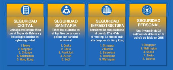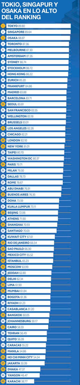 Los primeros puestos los ocupan las ciudades asiáticas de Tokio, Singapur y Osaka (top 3), seguidas de capitales canadienses, australianas y europeas. Madrid y Barcelona ocupan los lugares 12 y 13 del índice, y hay que descender hasta el puesto 15 para encontrar la primera ciudad estadounidense: San Francisco.