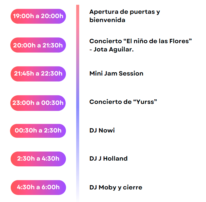 Podrás disfrutar de la música de artistas emergentes como Jota Aguilar o Yurss, de una mini jam session y acabar la noche de fiesta con las DJ Sessions de de DJ Nowi y J Holland.
